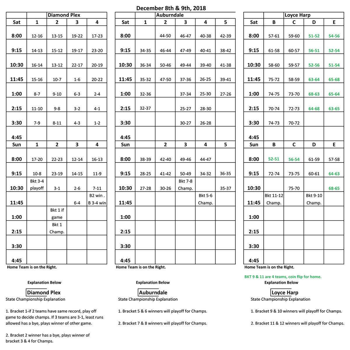 Due to potential incoming weather on Sunday, we may try to play your 1st scheduled game for Sunday on Saturday afternoon or early evening. Please be prepared to play 3 games on Saturday!
