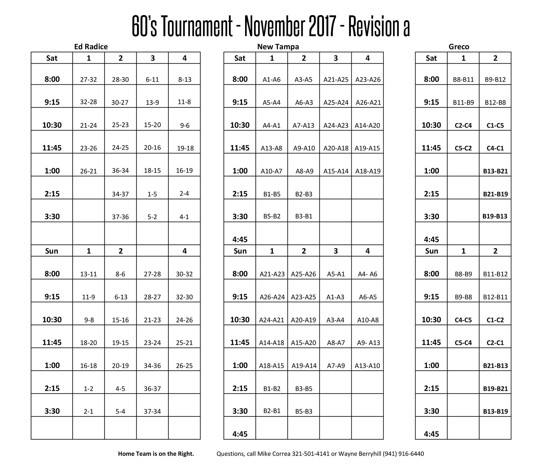Questions about the tournament or facilities:
