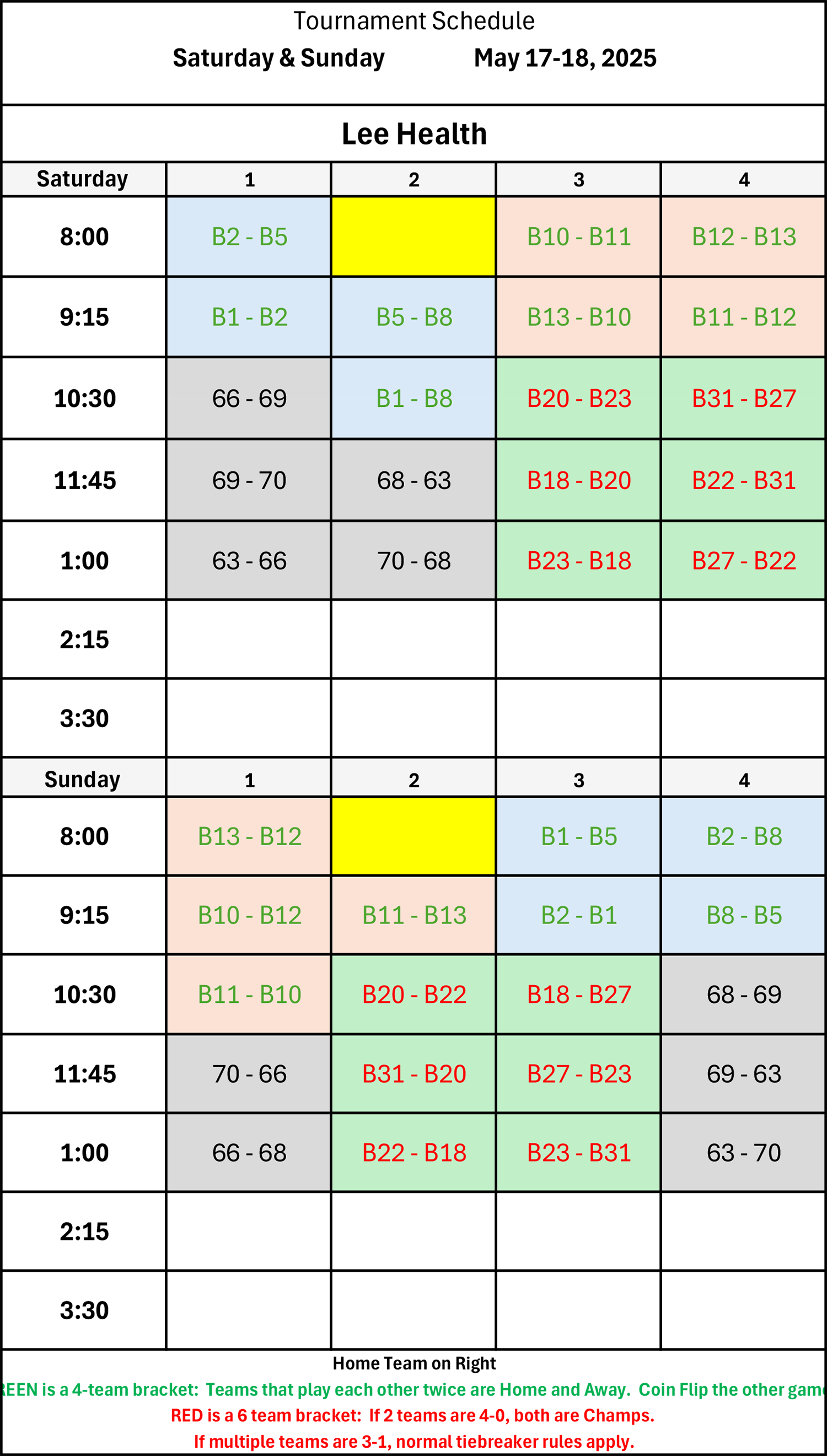 Home team on the right. | Brackets with 4 teams: teams that play each other twice are home & away. Coin flip the other games. | Brackets with 6 teams: if 2 teams are 4-0, both are champs. If multiple teams are 3-1, normal tiebreaker rules apply.