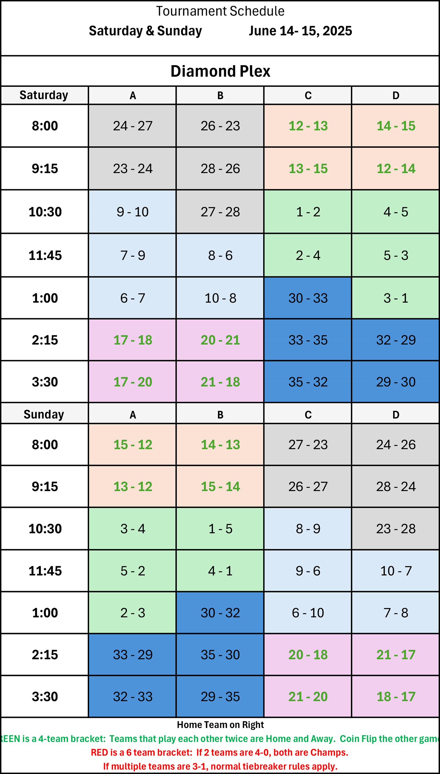 | 9:15 | 33 - 29 | 35 - 30 | 28 - 24 | 26 - 27 |