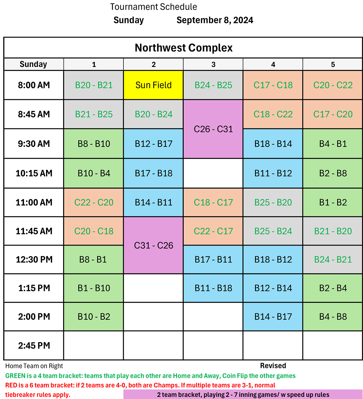 | 8:00 | C22 - C20 | Sun Field | C18 - C17 | B25 - B20 | B24 - B21 |