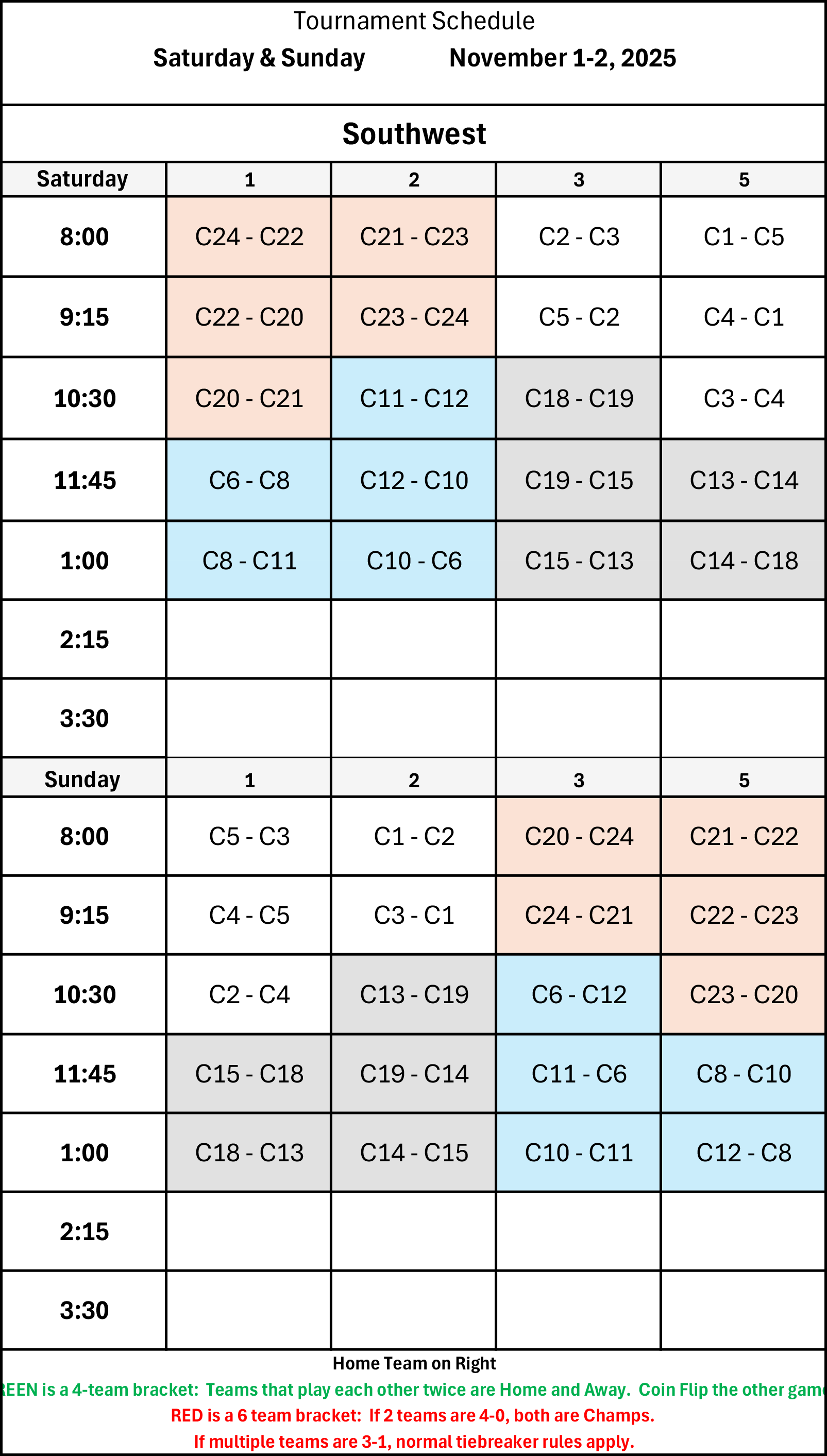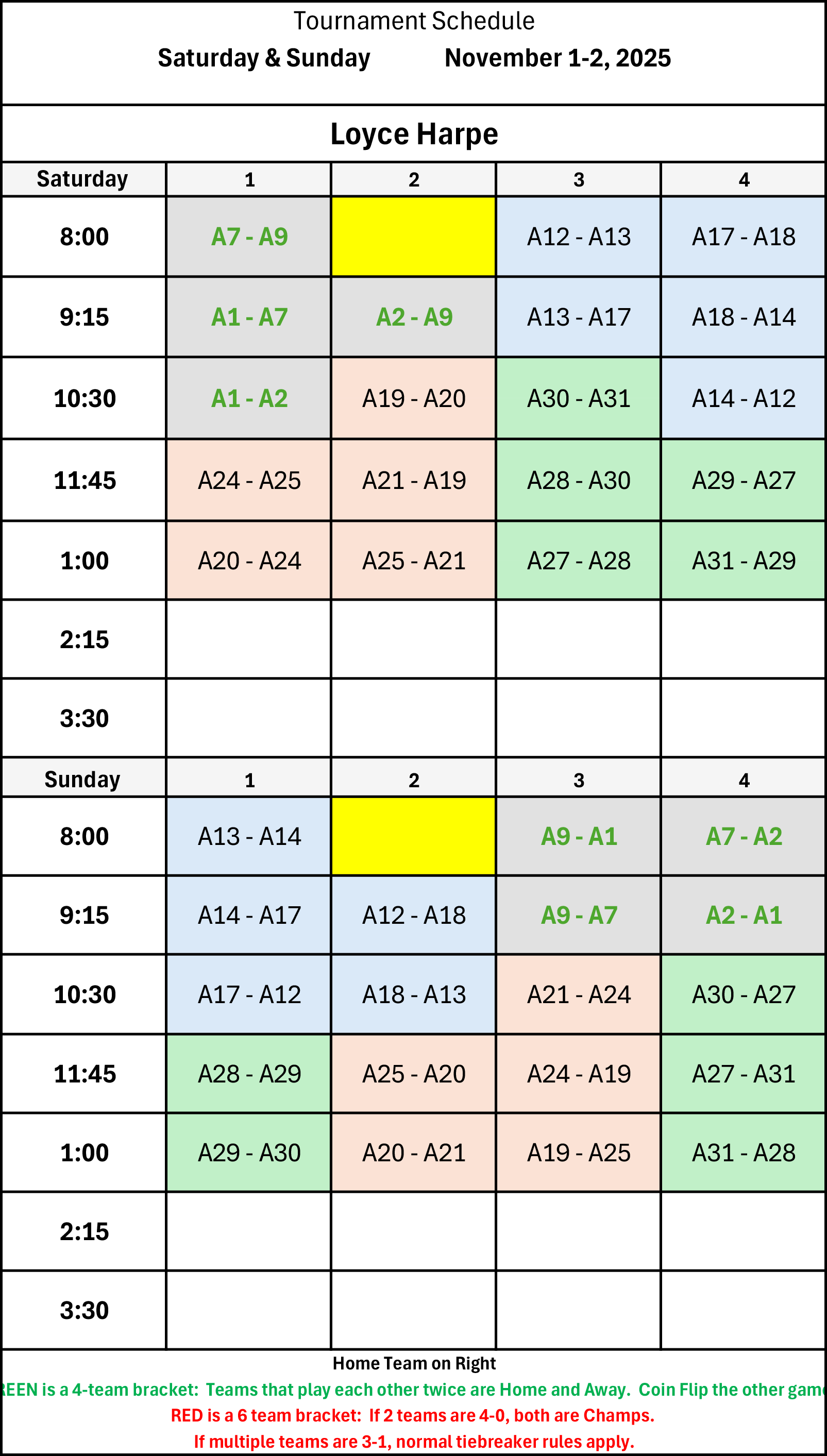| 8:00 | A34 - A32 | A33 - A35 | Sun Field | C25 - C26 |
